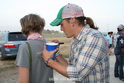 Hopped a ride to get up to the gate, paid our way in, made our way over to the grandstand, and found the merchandise tent. Said hi to Jonathan, and asked if he remembered me (I could tell that he didn't), and said I had talked with him at Rushville. And then he smiled and said "yes! Let me go talk to Dave.." and off he went. When he came back, he told us that Dave had said that all the Meet and Greet spots were taken, but that since we were such big fans, why not? Jonathan could try to set it up. Yay! one step closer! "Come back after the opener," he said. So we went to sit and listen. Rhi was not impressed, as the guy, while new, had a more old-school country sound. Did a great job on Folsom Prison Blues tho.. At one point, she was thirsty, so we went out to get some cold water. Got an extra one for Jonathan. Not because I thought it would change anything, but I had noticed he didn't have anything cold to drink, and was hot, and I was grateful for the effort he was putting in to making something happen. He looked surprised when I handed him the bottle, and I just told him I thought he could use something cold to drink. Maybe that added a little karma point, I don't know. We sat in the bleachers and people-watched - at one point the fair queens headed back stage. I started to comment to Rhi that one of the advantages to being the fair queen was getting to go back and meet... (pause as I see Jason walking towards the bus) Jason! I fumbled for my camera, and she laughed and said she knew. And I said NO - Jason! and got a quick picture.